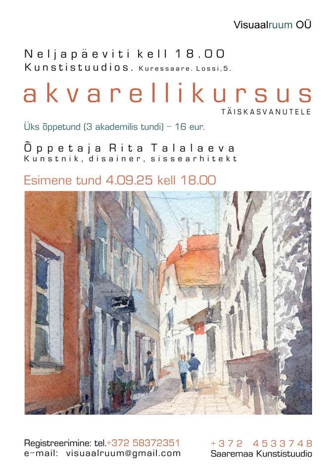 Akvarellmaali kursusele on oodatud kõik, kes soovivad avastada selle tundliku tehnika võimalusi ja õppida erinevaid võtteid. Tutvutakse maalimiseks vajalike materjalide ja töövahenditega, õpitakse kompositsiooni, valguse ja varju kasutamist ning värvide segamise põhimõtteid. Maalitakse natüürmorte, maastikke, loodust ja figuure.