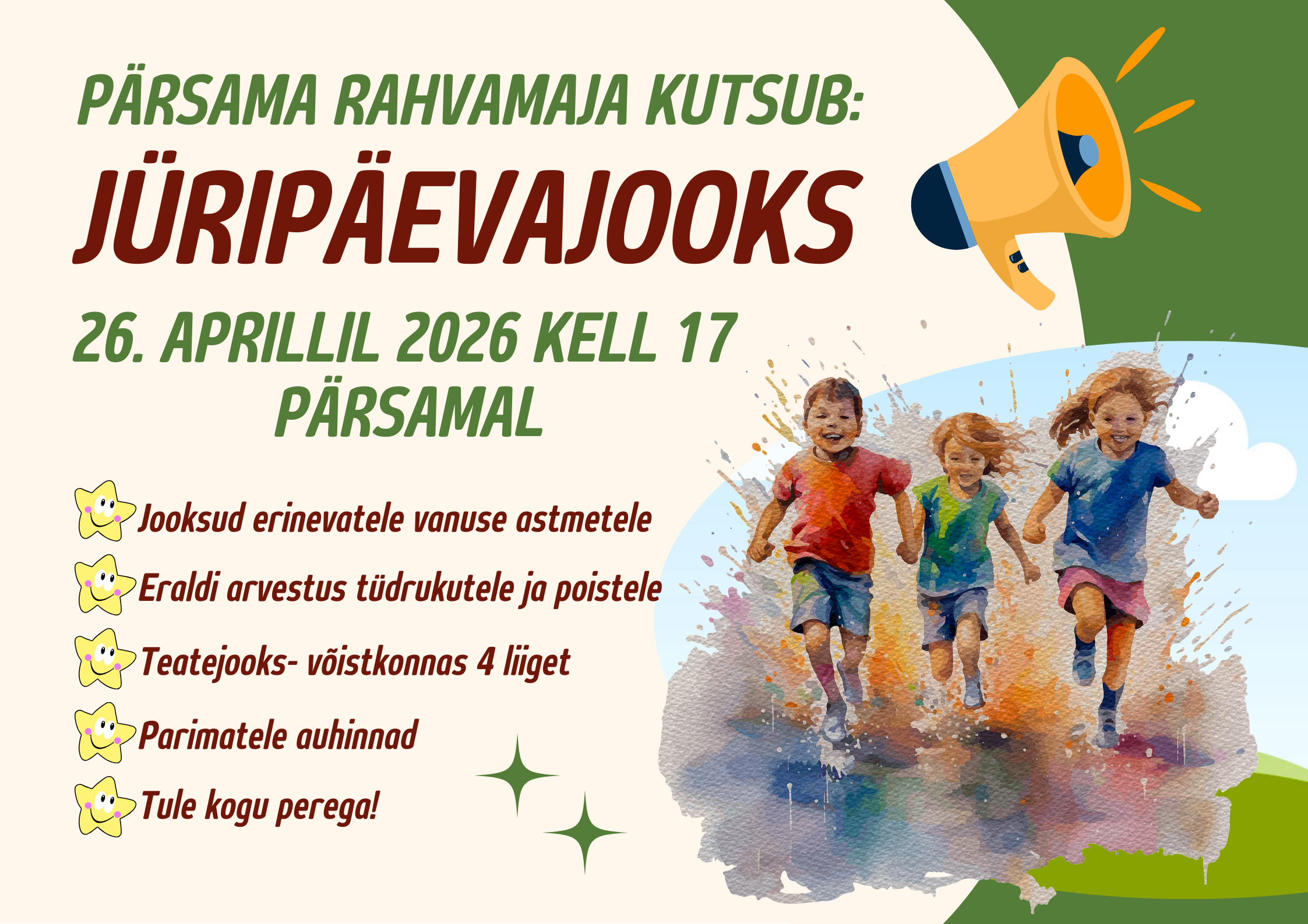 Jooksud erinevatele vanuse astmetele, eraldi arvestus tüdrukutele ja poistele, teatejooks- võistkonnas 4 liiget, parimatele auhinnad. Tule kogu perega!