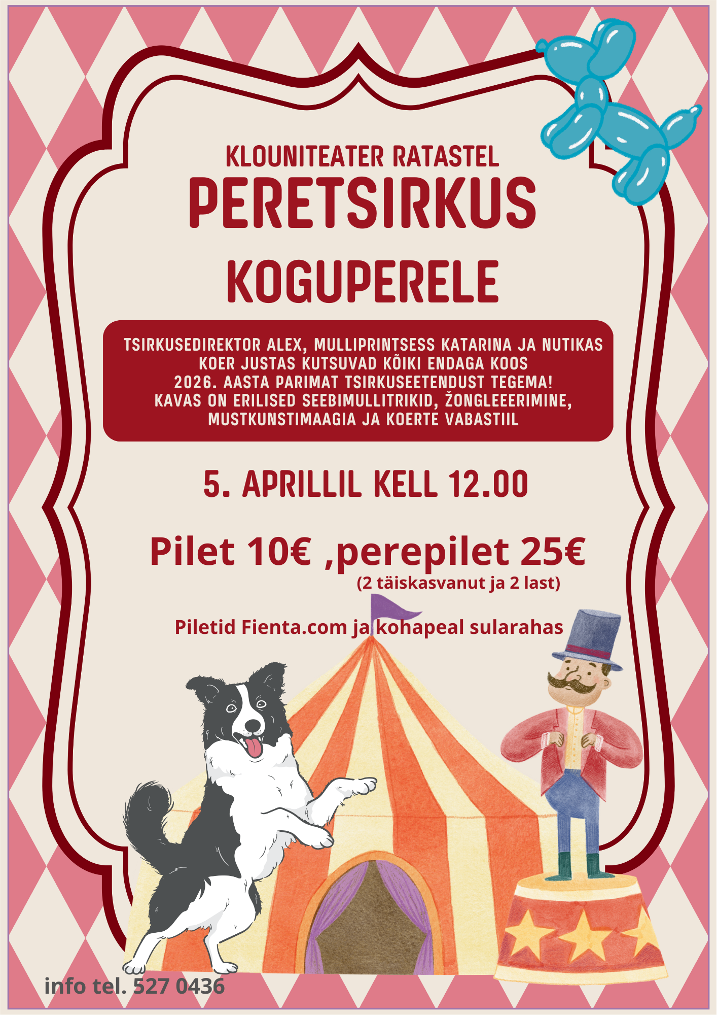 Tsirkuse direktor Alex, mulliprintsess Katarina ja nutikas koer Justas kutsuvad kõiki endaga koos 2026 aasta parimat tsirkuseetendust tegema!