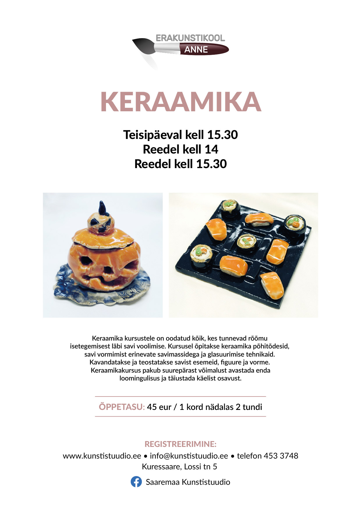 Keraamika kursustele on oodatud kõik, kes tunnevad rõõmu isetegemisest läbi savi voolimise. Kursusel õpitakse keraamika põhitõdesid, savi vormimist erinevate savimassidega ja glasuurimise tehnikaid. Kavandatakse ja teostatakse savist esemeid, figuure ja vorme. Keraamikakursus pakub suurepärast võimalust avastada enda loomingulisus ja täiustada käelist osavust.