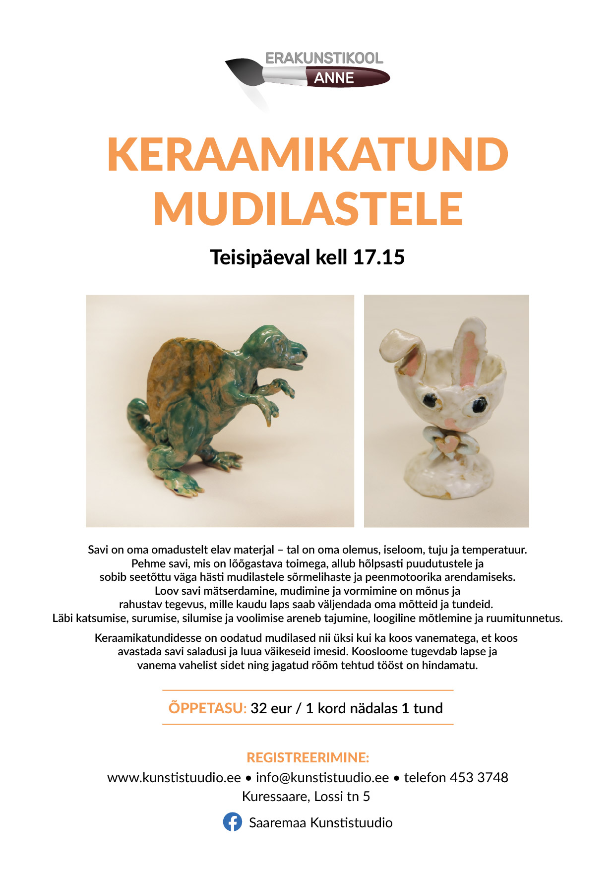 Mudilaste keraamikatunni kuutasu on 32 eur, korratasu 10 eur.