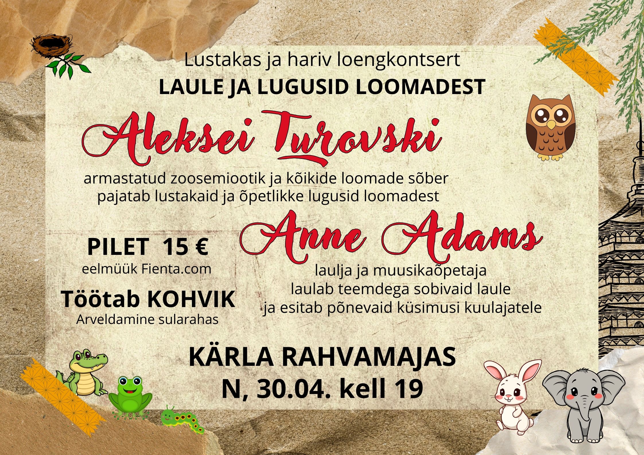 Lustakas ja hariv loengkontsert "Laule ja lugusid loomadest". Piletid eelmüügis https://fienta.com/et/aleksei-turovski-ja-anne-adams-karla-rahvamajas